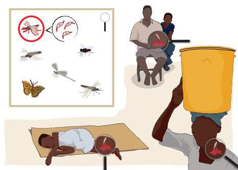 The visuals support stakeholder engagement teams in explaining the project to communities, illustrating key messages from malaria transmission to mosquito biology and genetic approaches.